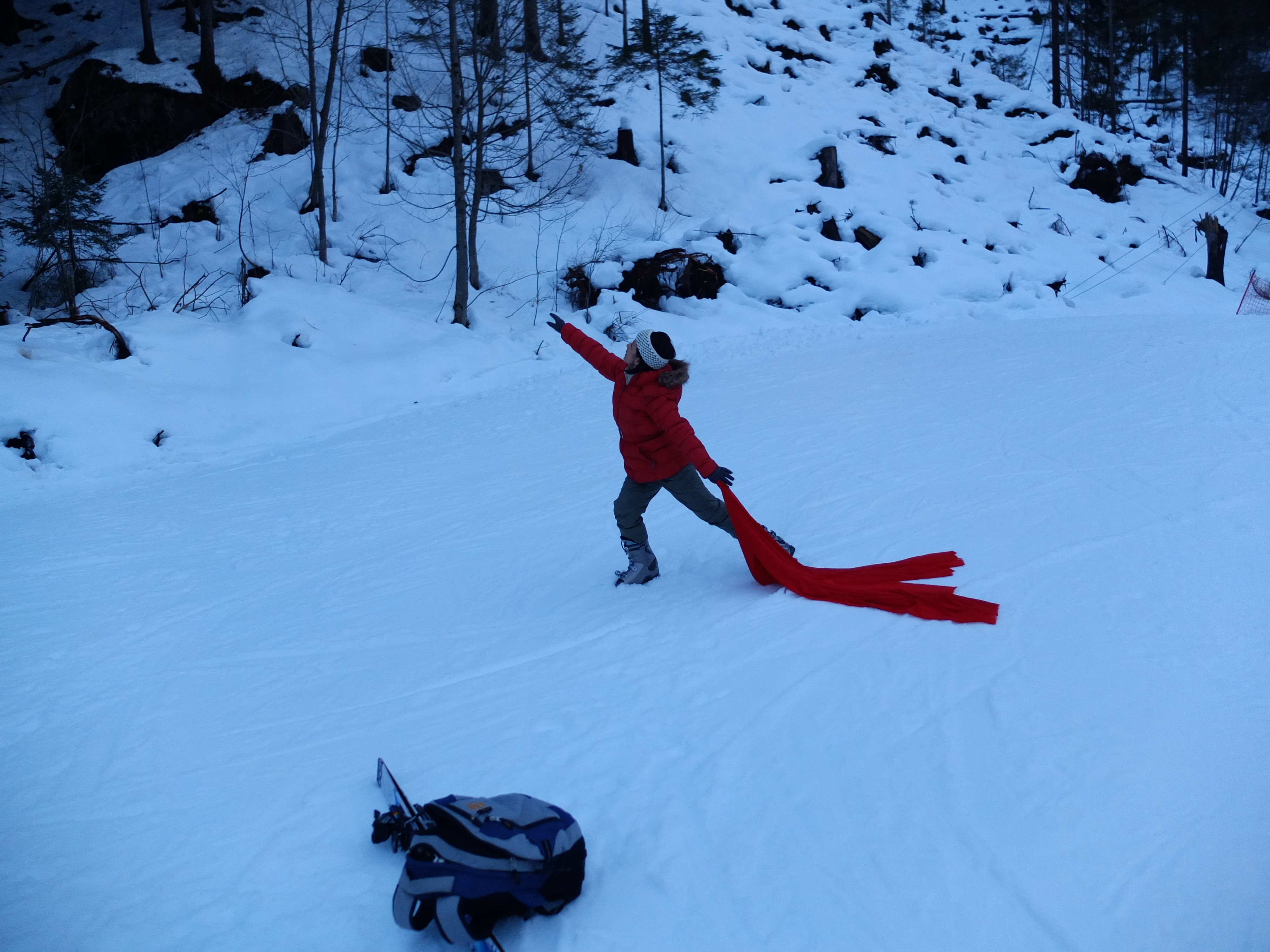 Era dezembro e em alta temporada do inverno frances, 14 graus negativos quando eu e minha familia fomos passar um final de semana e aproveitar para esquiar e conhecer o Mont Blanc. Na estação de esqui em meio áquela imensidão branca de neve foi impossível resistir ao impulso para a dança. Mesmo com a tão pesada bota para esqui e com a mobilidade reduzida tirei meu tecido vermelho da mochila e dancei!!! Foi maravilhoso sentir a neve fofa e me deitar nela envolta ao vermelho do tecido.