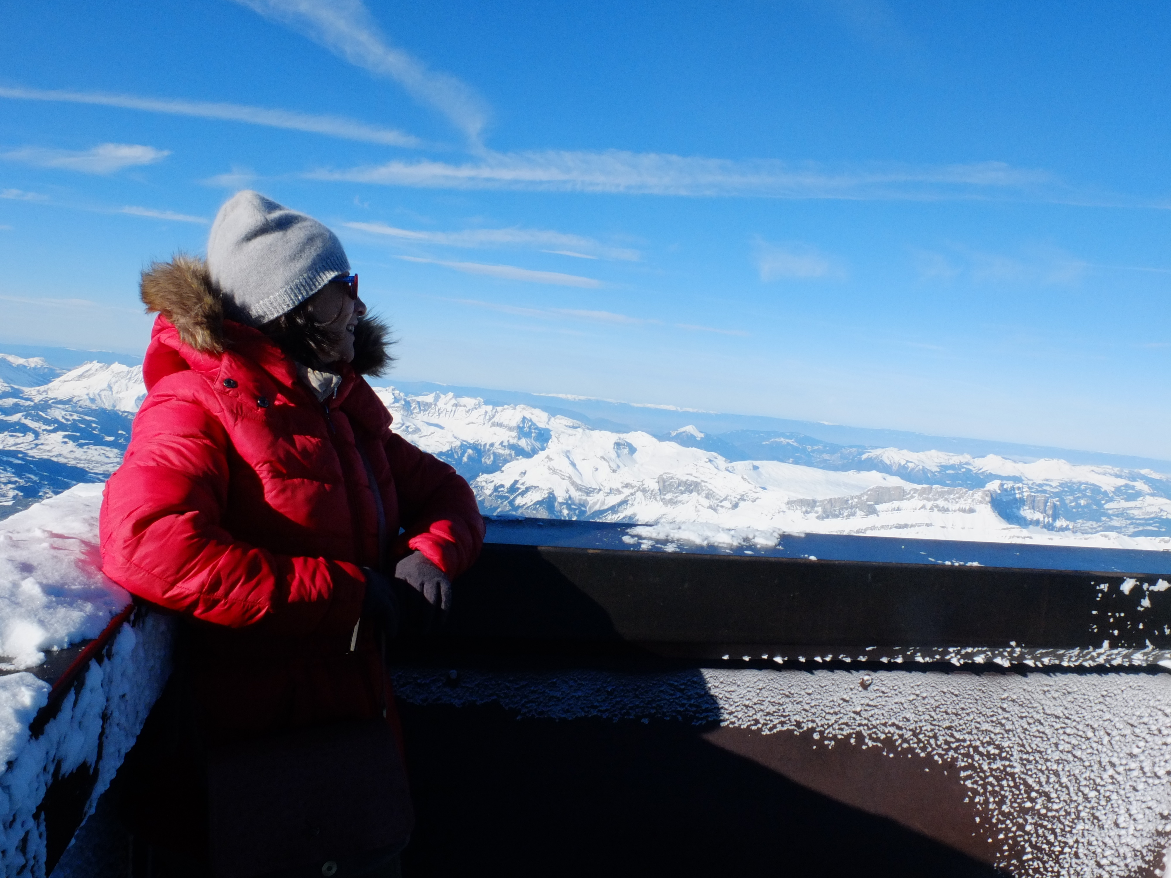 No dia seguinte ao subir no Aiguille du Midi fomos impactados com a beleza e a sensação da altura em meio aos cumes cobertos de gelo e neve. O frio era tão grande que nossos pés e mãos congelavam dentro das botas e das luvas. Muitos esquiadores subiam de teleférico para descerem os montes com seus esquis e eu fiquei ali olhando aquilo tudo: a cidade lá embaixo tão pequenininha, o céu tão pertinho e tão longe, o vento frio no rosto, o ruído das pessoas e eu pensei em Deus! Que artista!!!