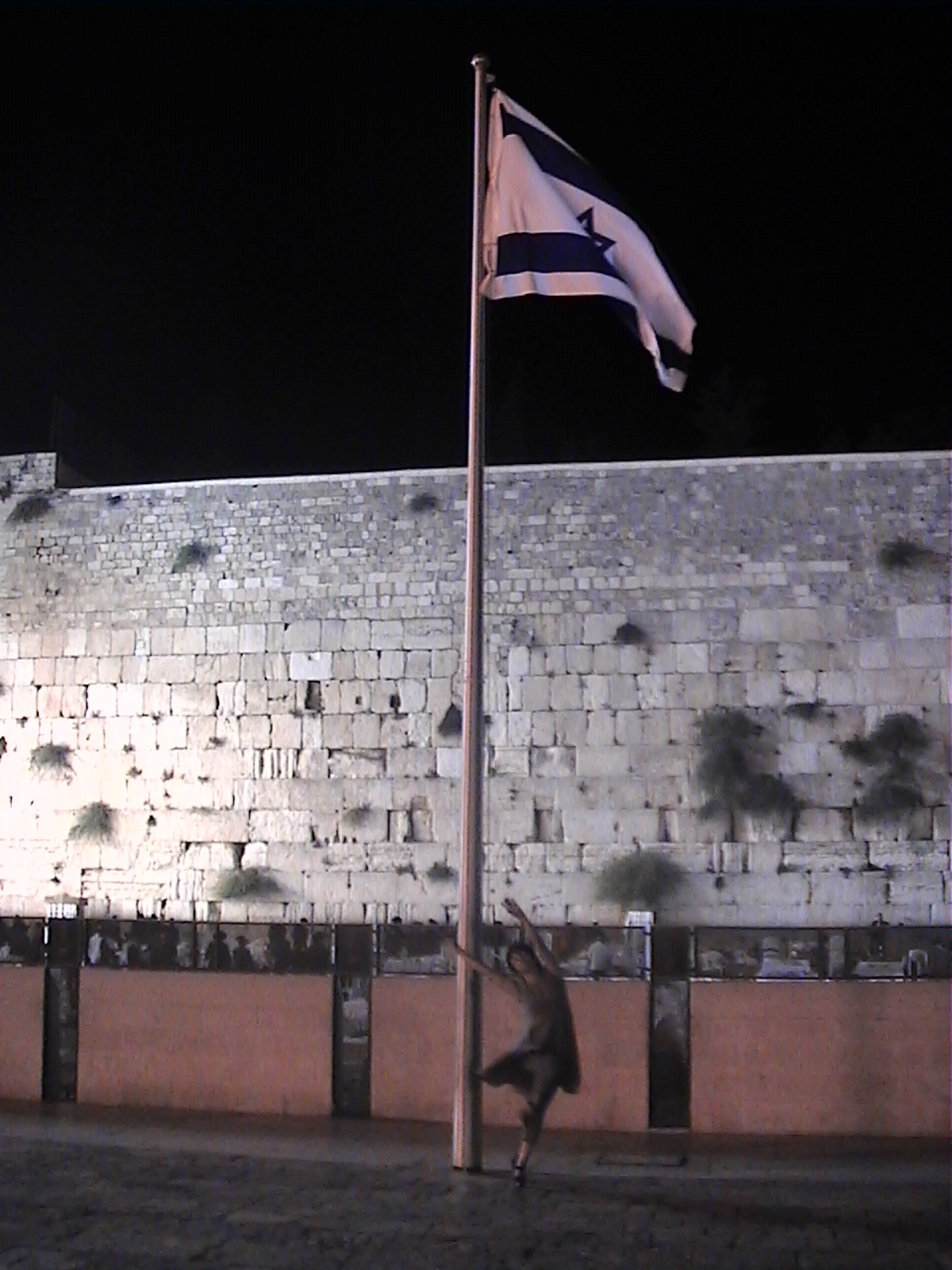 Na sequência fomos para o Muro das Lamentações e sentamos numas cadeiras ali por perto, quando fui atraída pela grande Bandeira de Israel que descansada no mastro se mantinha quietinha sem movimento algum. Caminhei até o grande mastro e lá, comecei a sentir uma brisa leve que começava a soprar.  À medida que a bandeira começou a se mover também comecei a me movimentar. A bandeira ia levemente para a direita e meu braço também ia. Ela ia para a esquerda, meu braço esquerdo a acompanhava. E nesse “mover”, pouco-a-pouco, o vento encheu a bandeira de movimento e eu me enchi de dança acompanhando os movimentos daquela bandeira, quando serenamente a brisa cessou e eu parei de dançar.